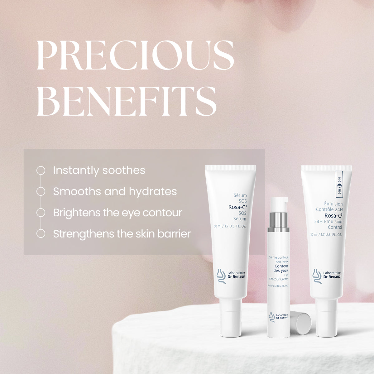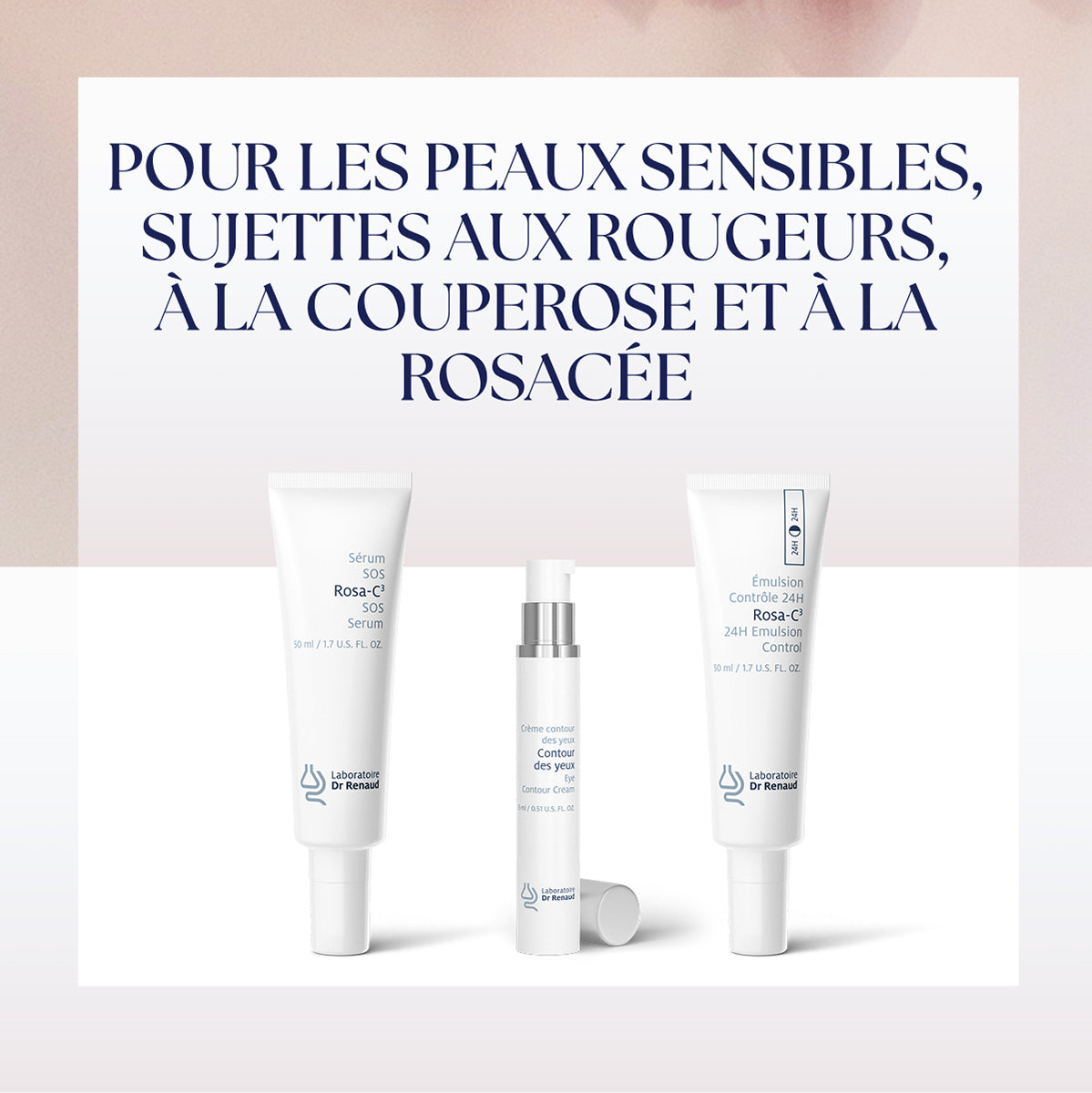 This routine combines the highly concentrated Rosa-C³ SOS 24h Serum, the Anti-Fatigue & Anti-Wrinkle Eye Contour Cream, and the hydrating and corrective Rosa-C³ 24h Control Emulsion. Together, these formulas help reduce the appearance of redness, reinforce the skin barrier and improve the look of a more even, soothed complexion.