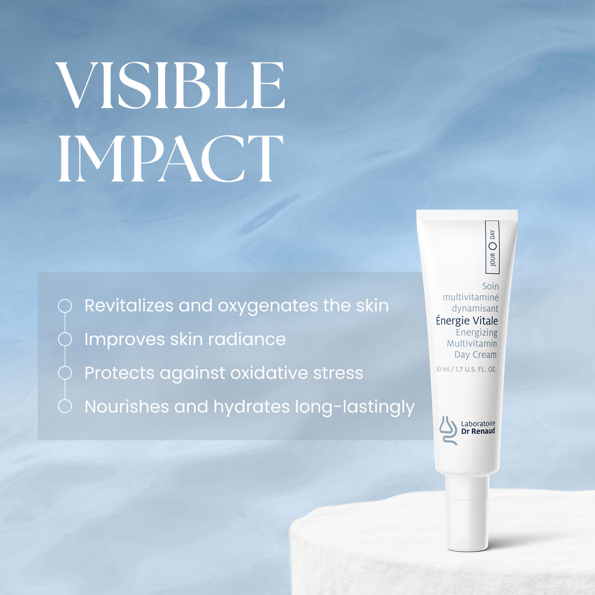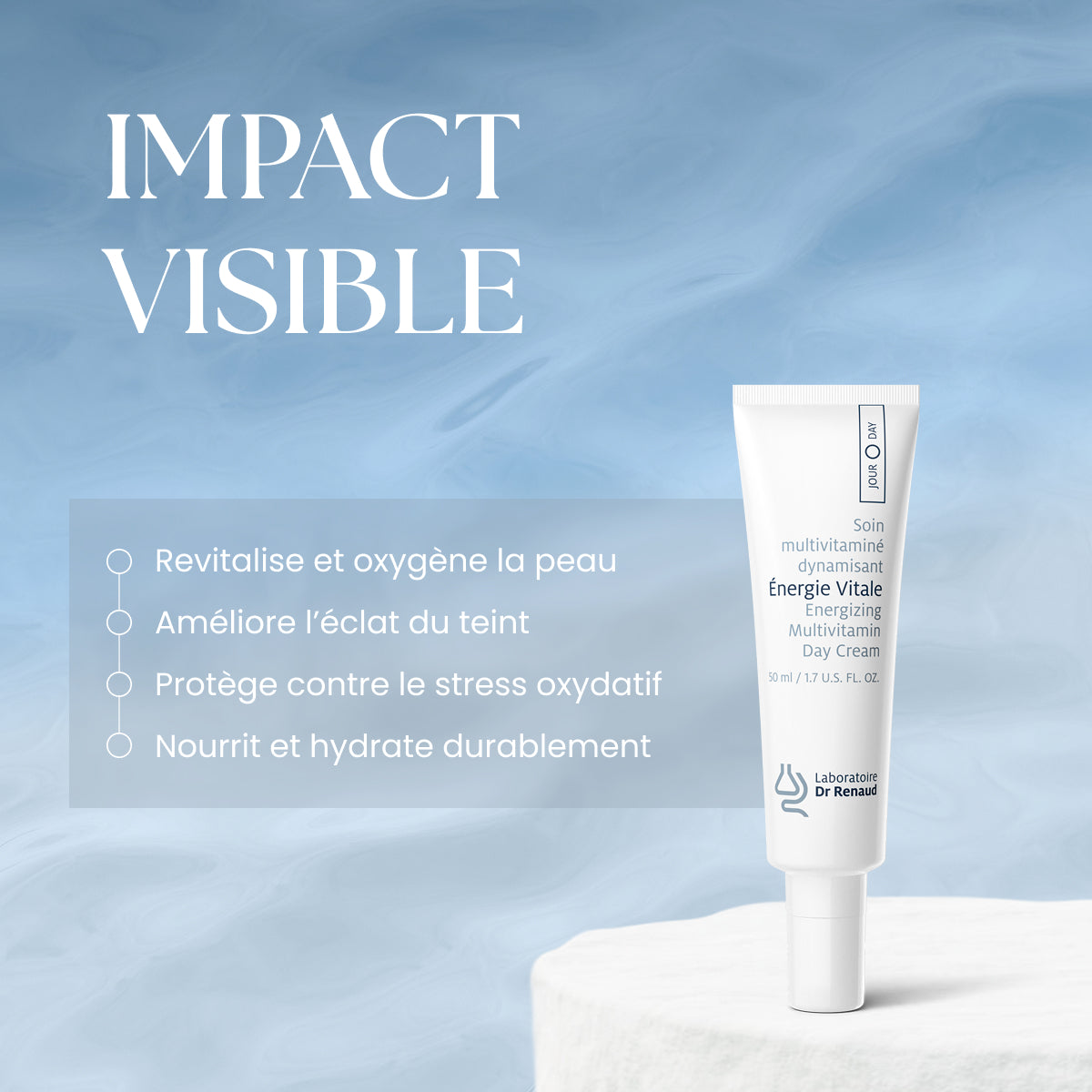 Formulated with a multivitamin complex (vitamins A, E, minerals), beech bud extract, and mineral salts (calcium, magnesium, potassium), it boosts cellular oxygenation and restores energy to the skin. Its creamy texture leaves a fresh, radiant finish.