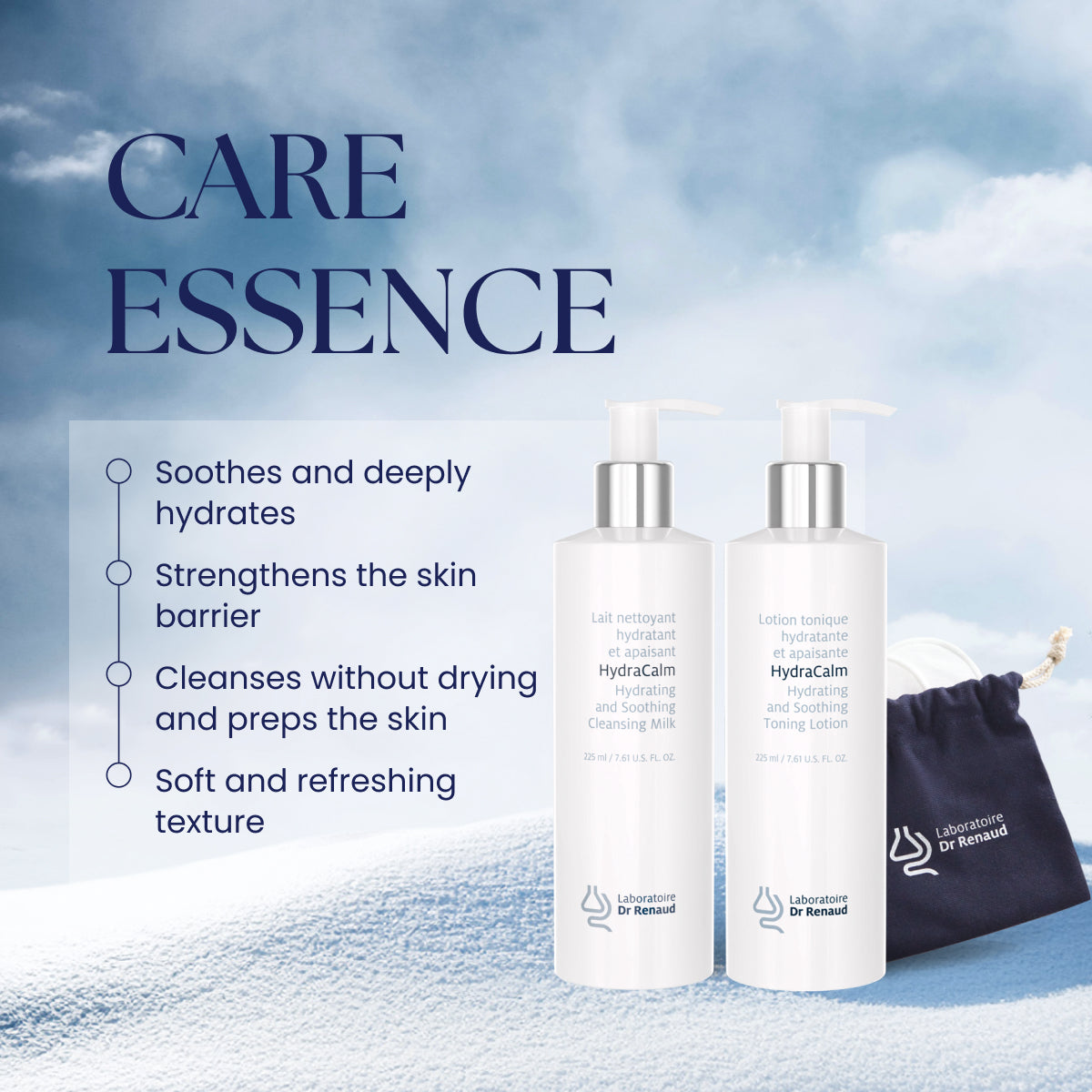 1. Morning and evening, apply HydraCalm Cleansing Milk to the face and neck.